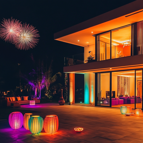 A cinematic view of a lively Diwali house party outside a modern, luxurious villa, decorated with vibrant lights and colorful decorations. The villa is illuminated with glowing lanterns, and the night sky is lit up by dazzling fireworks. The atmosphere exudes warmth and joy, with bright colors reflecting off the sleek architecture of the modern villa. The vibrant, festive lighting creates an exciting and energetic vibe, perfect for a Gen Z Diwali party invite, highlighting the luxury and celebration in a stylish, modern setting.