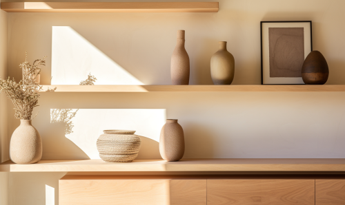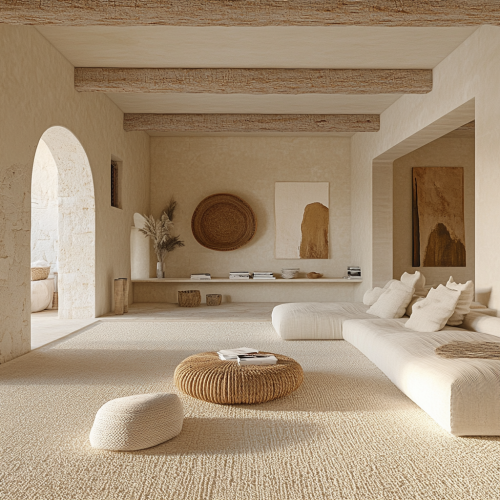 Photorealistic hd resolution image of a large sitting room in a modern villa in Maiorca. Walls and floor are in cream resin with some carpets in sisal natural colour. There is a high ceiling with some bleached wooden beams. On the walls there are some modern minimal appliques. In one of the walls there are some niches with art objects and art books.