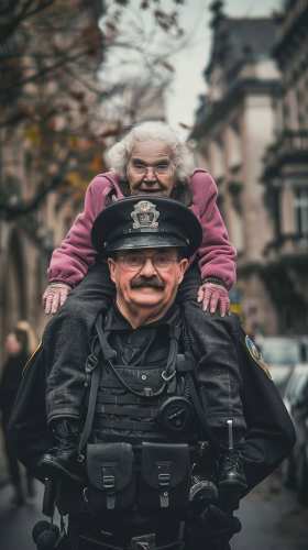 a photorealistic shot of a special police officier carrying a grandma on his shoulders in the streets. The police officer has a moustache, a full black strapped uniform, and a very serious expression. The grandma has a pink dress and looks very happy. raw style --ar 9:16 --v 6.0