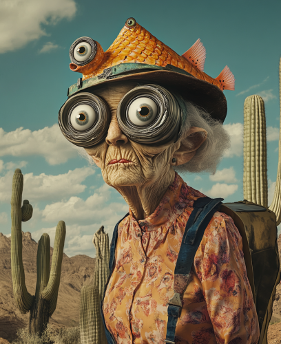 Alejandro Jordowsky surreal acid surreal Salvador Dali style photography of an old grandma wearing a tank hat and a futuristic fish mechanical dress in front of a surreal desert with cactus with cute eyes and big mouths --ar 9:11