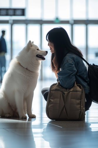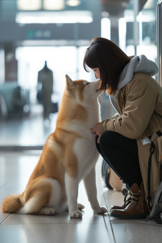 The Akita dog eagerly greeted its female owner, a Chinese girl, at the arrival hall of the airport. The scene was adorable and heartwarming, set in a modern international airport arrival lounge, brightly lit and spotlessly clean,hyper realistic, super detailed, 8k, in the style of hasselblad hc 100mm f/2.2 --ar 2:3 --v 6.0
