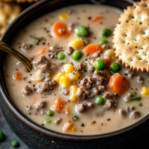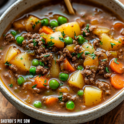 Close-up of a bowl of hearty shepherd's pie soup, filled with ground beef, diced potatoes, carrots, peas, and onions in a savory broth. The soup has a thick, comforting consistency, with vibrant colors from the vegetables and ground beef pieces scattered throughout. A sprinkle of fresh herbs, like parsley, adds a touch of green. The bowl is placed on a rustic wooden surface, with a spoon resting inside, creating a warm and cozy presentation. Text overlay includes the title 'Shepherd's Pie Soup' and a list of ingredients like ground beef, olive oil, and diced onion