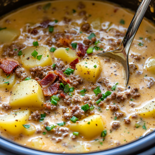 A close-up shot of a slow cooker filled with a creamy potato and ground beef soup. The stew features tender chunks of potatoes, ground beef, crispy bacon pieces, and a sprinkle of chopped green onions on top for garnish. The soup has a rich, creamy texture with a slightly golden color, showing bits of melted cheese and seasonings. The ladle resting inside the soup adds a homely feel. Soft, natural lighting with a shallow depth of field, capturing the warmth and comfort of a homemade, rustic soup