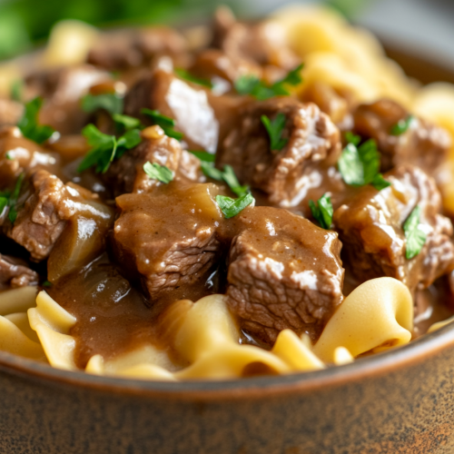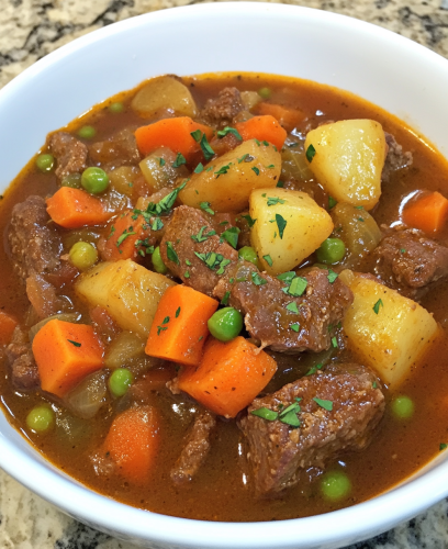 An amateur photo of a hearty bowl of beef barley soup, filled with tender chunks of slow-cooked beef, barley grains, and colorful vegetables such as carrots, celery, and red bell peppers. The broth is rich and savory, with a deep reddish-brown color, likely from slow simmering and the beef's natural juices. The soup is garnished with a sprinkle of fresh herbs, adding a touch of green. The dish looks warm, comforting, and perfect for a cold day, with vibrant colors highlighting its homemade quality.