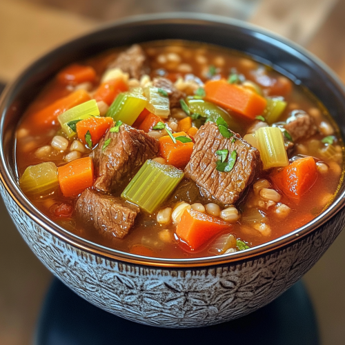 Hearty beef barley soup with vegetables and barley
