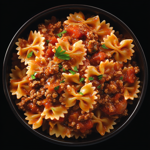 Create an image of a hearty pasta dish featuring bowtie (farfalle) pasta coated in a rich tomato-based meat sauce with ground beef. The pasta is garnished with finely chopped parsley, adding a fresh pop of green. Small chunks of tomato are visible, adding texture and color contrast. The dish is presented in a dark bowl, emphasizing the vibrant colors of the sauce and pasta. Above the bowl, the text reads 'Bowtie Pasta with Ground Beef' in bold black letters, and below it, there’s a short ingredient list that includes '12 oz bowtie pasta, 1 lb ground beef' in a warm, inviting font