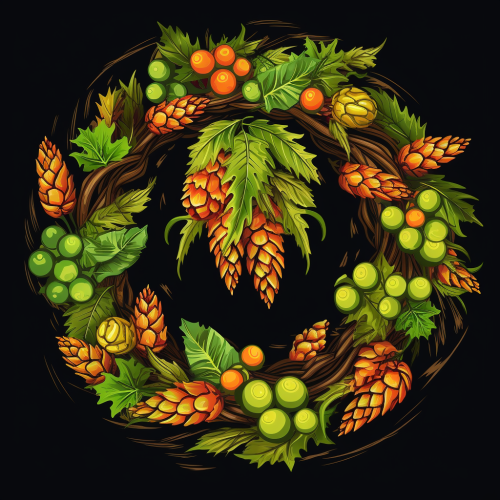 A Christmas wreath made of beer hops and barley, bright colors, vector for t-shirts