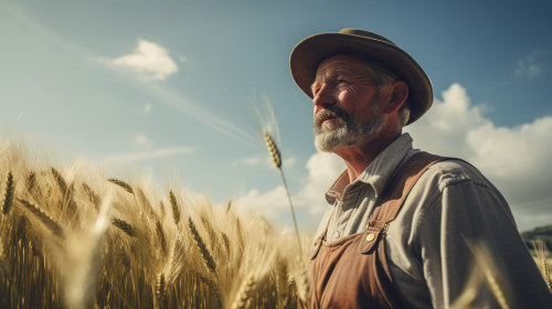 hiperealistic photo of an irish farmer in a field of barley, sunny day. The photograph is taken with a Hasselblad X1D II 50C with an XCD 45mm f/ 3. 5 lens, hyper realistic, Cinematic Lighting, Beautiful Lighting, Accent Lighting, Global Illumination, Screen Space Global Illumination, Ray Tracing Global Illumination, Optics, Scattering, Glowing, 16k --ar 16:9