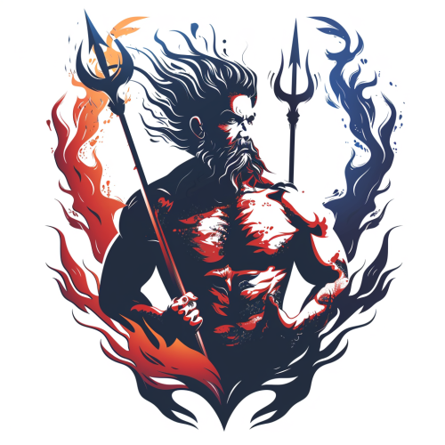 A Logo for an air conditioning company. The logo is of the Greek god Triton with air and fire around him and his trident. The logo is going to be sleek, modern, and hyperrealistic. The background is going to be white. The colors are going to be dark blue and red.