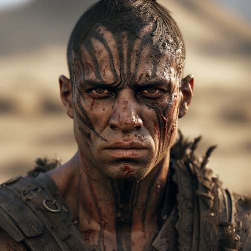 A handsome warrior captain with a muscular humanoid face and body with metallic bronze skin that hardens into armor with metallic hue, intricate tattoos of warrior achievements, clad in minimal dark leather attire with fur accents and royal blue royal cloak. Ultra realistic and finely detailed handsome face. He stands on a rocky edge, The humanoid with a barbarian sword, attractive and determined gaze embody resilience and strength, ready to face any challenge. UHD, 4K, --v 6.0