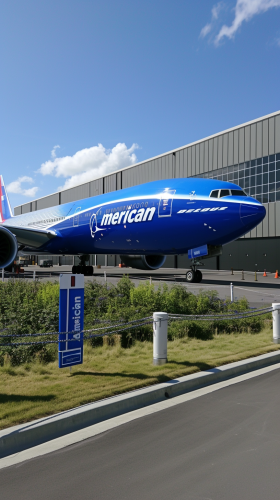 full scale Boeing 777X with a text: "American" Americana inspired paint job parked outside large Boeing facility --ar 9:16 --v 6.0