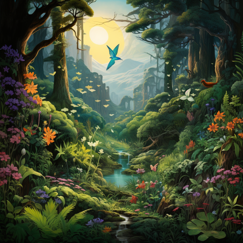 ancient flora and fauna in the mountains lush green vibrant plants and animals