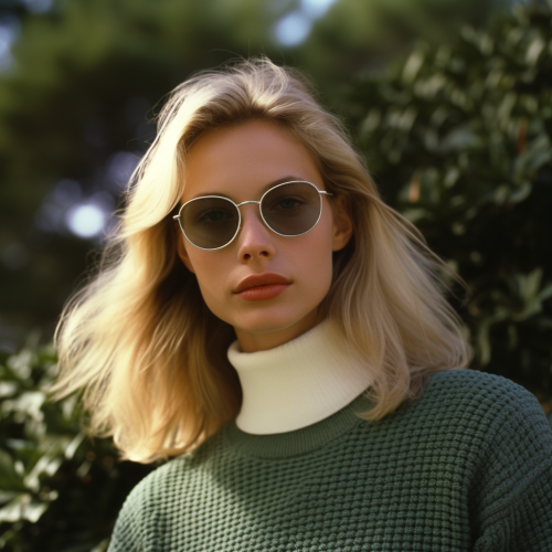 1980s photo beautiful blonde woman, green hedge maze background, relaxed expression, wearing white cableknit sweater, old money vibe, long blonde hair, blue eye, pouty full lips, wearing RayBan sunglasses, sunglasses ad commercial, innocent looking, hazy, nostalgic feeling, ar 4:5