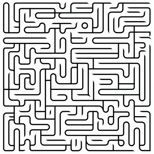 An overhead photo of a colorful maze with walls made of transparent acrylic, each wall in a different vibrant color. The walls are illuminated from below, casting glowing reflections throughout the maze. The angle shows some of the maze paths clearly, emphasizing the illuminated acrylic materials and the complexity of the labyrinth.