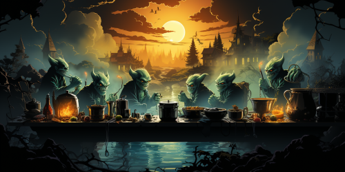 simplistic professional vector of goblin friends brew a beer together around a cauldron, from a distant view Charles Burns and HR Giger style, gold, blue, green, psychedelic art, flat design --stylize 1000 --chaos 10 --ar 8:4