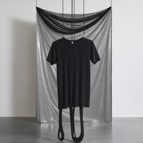 a black t-shirt hanging from black speckled paracord rope and caribeners in a photography studio, in the style of helmut lang there's thermal foil in a big square as a backdrop