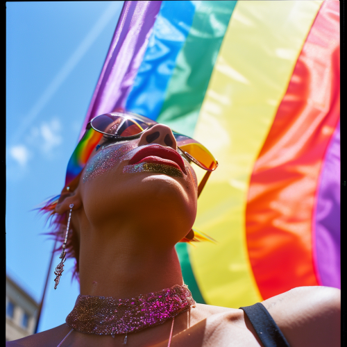 portrait of a drag queen at pride festival with glitter eyeshadow, cinematic lighting, 30mm lens, shot in 2023. candid, modern, sunshine, rainbow flags cinematic realism, shot with hasselblad 30mm, Kodak Ektar 100, --ar 1:1 --v 6.0 --style raw --s 50