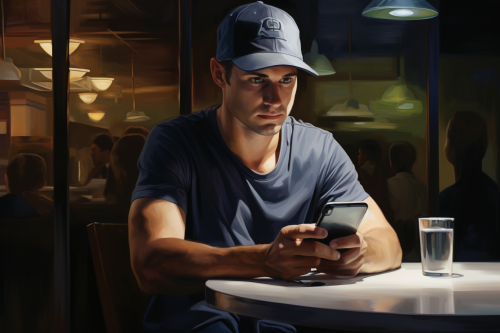 golf player wears a cap and sits in a cafe and taps on his mobilephone, --ar 3:2