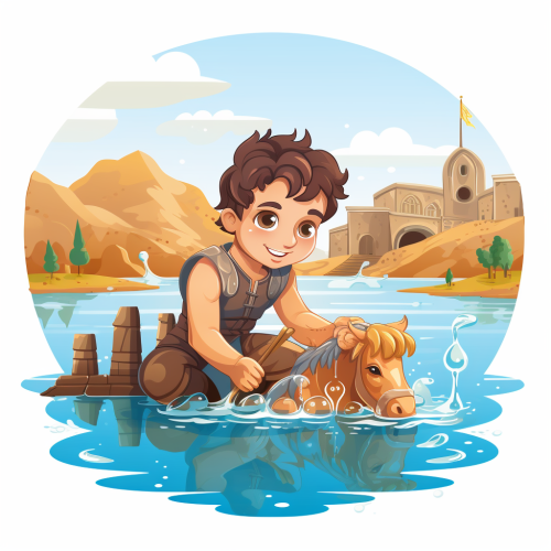 baby hercules cleaning the augean stables with a river, cute illustration, flat vector art style