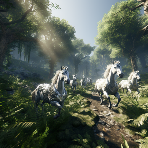 a diverse herd of unicorns running in a tropical jungle, action scenes, junglecore, panorama view, cinematic, high detail, photorealistic, unreal engine.