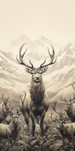 Drawing of a herd of deer, realistic, a herd of deer in the middle of a field surrounded by mountains. --v 5.2 --ar 9:18