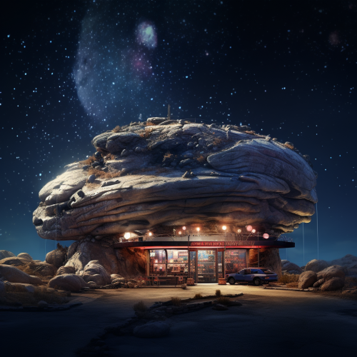 a great rock, with a restaurant and a gas station, floating in the universe with galaxies as background