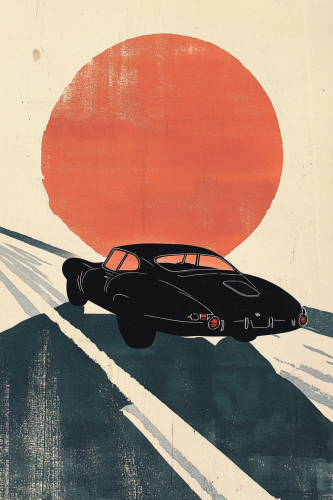 Woodblock print of a Jaguar E-Type silhouetted against a large setting sun, black car with elongated shape casting a shadow, white road and sky, a soft red sun setting on the horizon, strong contrast and bold textures --v 6.1 --s 50 --ar 2:3