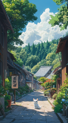 A white cute dog is leisurely spending time by a beautiful river in the Japanese countryside during the daytime. The sun is shining brightly in the sky, creating a peaceful and picturesque atmosphere. Sunflowers are in the foreground, adding a vibrant touch to the scene. The scene is depicted in Makoto Shinkai's anime style, with intricate details and vivid, beautiful colors. The scene feels dreamlike, with a calm yet powerful energy. --ar 9:16 --v 6.1