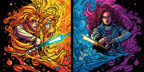 Hermione Granger in an epic fight against evil force, magic duel, tile design, 80s comic book cover, in the style of Stanley Mouse, in the style of Jim Phillips, in the style of Rick Griffin, in the style of Steve Nazar, in the style of R.K. Sloane, 80's retro color palette, T-shirt design graphic, vector, contour, edges --style pYKPHuFnWwWBDeX --ar 8:4