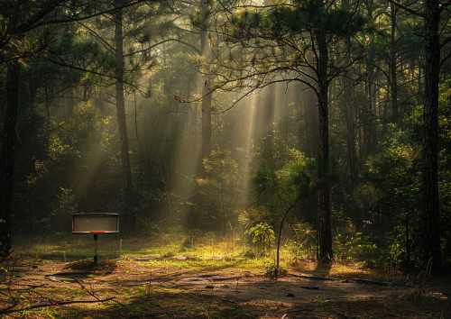 photograph of disc golf basket in the forest, wide shot, rays of light show though the trees, morning light, high definition --ar 7:5 --v 6.0