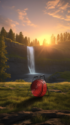 A disc golf bag sitting in a beautiful disc golf fairway. There is a disc golf basket in the fairway. A sunset and waterfall are in the background. Photorealistic, 8k --ar 9:16