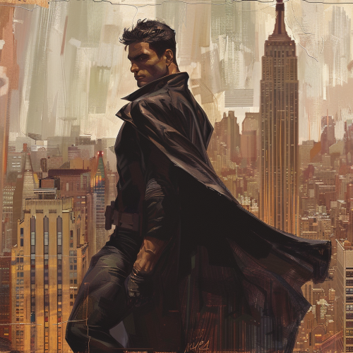 It looks like a New York American comic book hero, male, cool, Manhattanville can be seen.