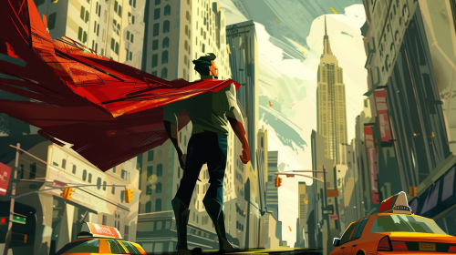 Looks like an American comic book hero in NY, male, cool, red cape, Manhattan buildings visible, yellow cab visible. style cartoon --ar 16:9