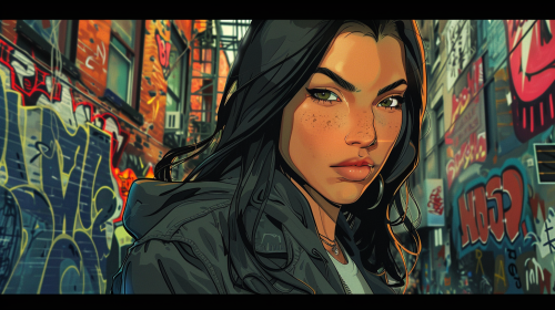 Hero: [Smirks] Funny, I was just about to say the same thing. famale style cartoon and Alleys in New York, Manhattan in view, American comic book style woman, cool. --ar 16:9