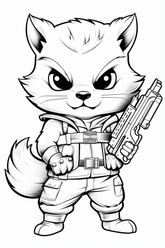 badger furry anthropomorphic, crouching fighting stance, hero with gun, kawaii drawing style, black and white, adult coloring page --ar 2:3