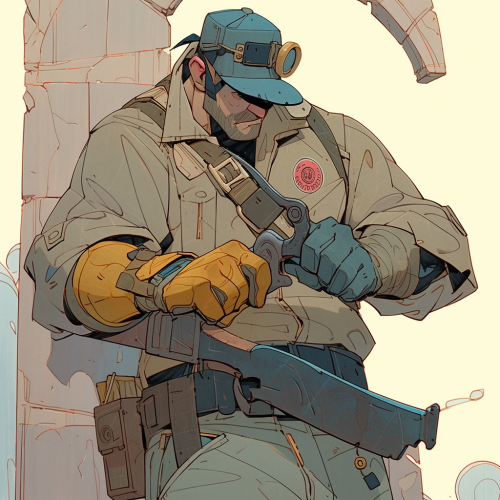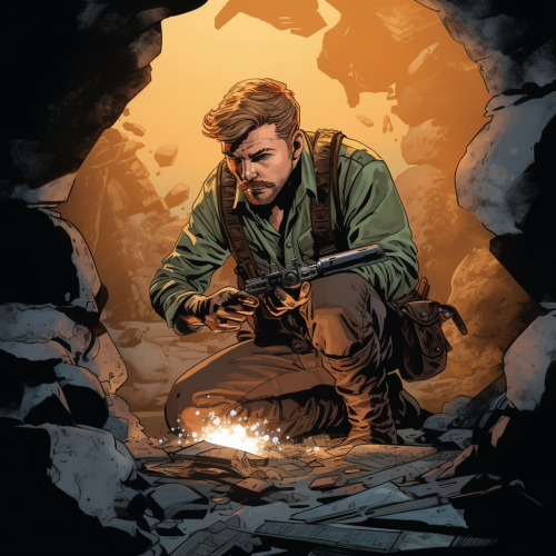 Marvel comics style hero/archaeologist preparing before a battle, with a gun --niji 5 --s 750 --style expressive