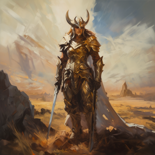 Heroic oil painting. She is a knight, wearing a full horned helm and plate armor, standing on a battlefield, dynamic pose