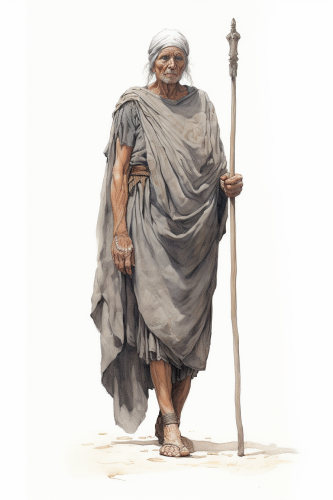 drawing of ancient Macedonian hoplite old woman, veteran, full body, full perspective, --aspect 2:3