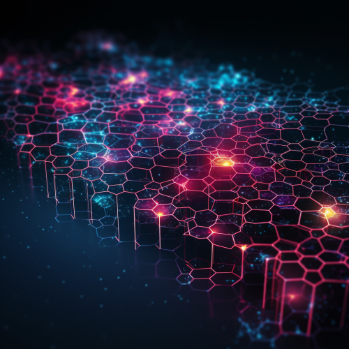 futuristic, tech-inspired illustration with a transparent background, featuring interconnected symetrical hexagons, glowing blue diffirent shades of blue to white nodes, The design is clean and minimal, with soft glows around the nodes to add depth, perfect for overlaying on any surface.