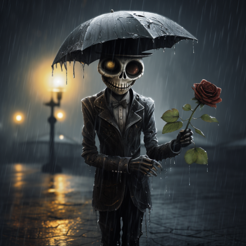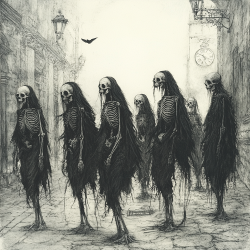 Create an eerie scene featuring a procession of skeleton figures dressed in tattered black attire, each with long, flowing hair. Render the skeletons in meticulous cross-hatching to capture the textures of bone and worn fabric, creating a haunting depth. Use subtle shading to bring out the detailed intricacies of their attire, enhancing the sense of decay. The characters should have a simple yet unsettling appearance, with empty expressions and an unnatural, timeless quality. Set them against a minimalistic background with fog or faded buildings, allowing the empty streets to emphasize the eerie solitude. Incorporate symbolic motifs like a crow perched nearby or a faint clock in the distance to add a sense of foreboding.