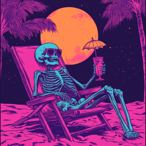 vector graphic vaporwave skeleton lounging in a hot pink beach chair under a glowing moon, wearing sunglasses, and sipping a drink with a tiny pumpkin umbrella.