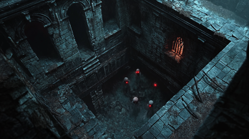 Dark medieval castle, closeup of caved in floorboods, rotting wood, beneath the floor are ghostly human figures with red eyes, spooky, style of video game concept art, top down view, --ar 16:9