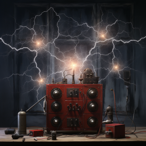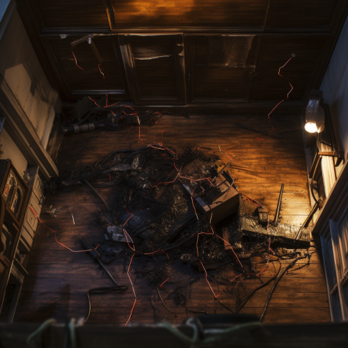 an overhead view of damaged piping and electrical wires, with many sparks and leaks. They are just under the floorboards and visible due to a large hole.