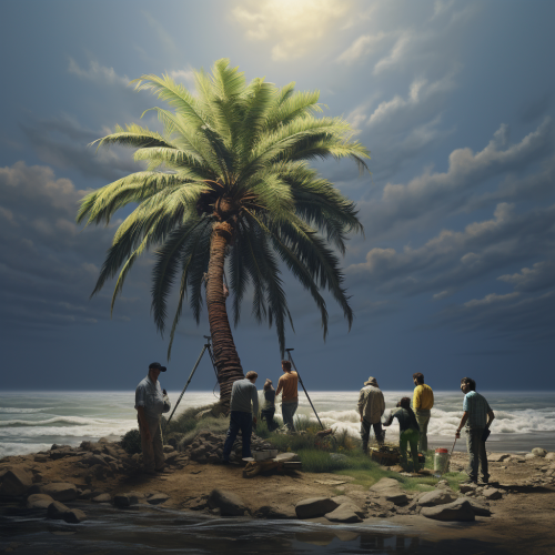 Close-up of a palm tree trunk wrapped in delicate string lights, sun-kissed beach and azure sea in soft focus background, textural, warm, inviting, gentle sea breeze rustling palm