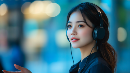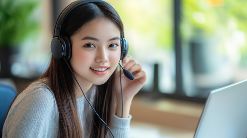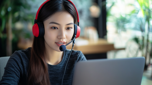 high definition ultra quality high contrast photo of a young beautiful asian woman wearing the headphone set with microphone talking to a client, sitting in front of a laptop, customer service concept, the woman is looking at the laptop --no logos --ar 16:9