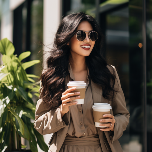 a photo of an candid asian woman with 5 fingers on each hand showing off her new nails that are painted with a shimmery sage green color, the nails are shaped in a short square shape. the woman is wearing a beige top. The photo looks candid like it's from an influencer taking a selfie but in the style of aritzia. Canon camera with an aperture of 5.2