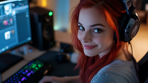 Quality photograph of an attractive female approximately 23 years of age. She is sitting at a computer desk, she has headphones on her head, she is wearing a T-shirt. She has red hair. Positive atmosphere, the girl smiles and looks at the monitor. High quality --ar 16:9