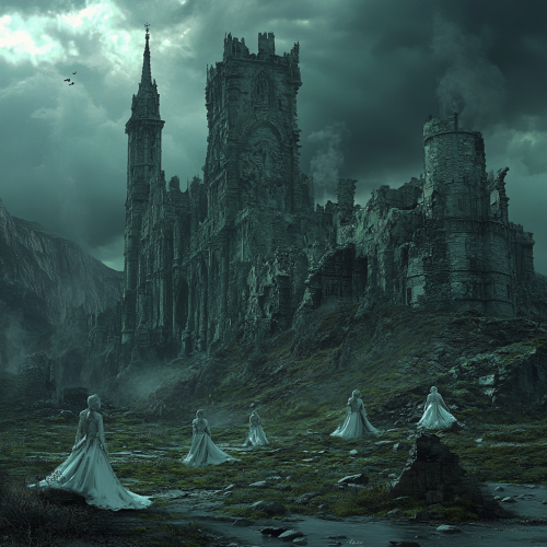 a destroyed kingdom that had been ruined by floods and taken over by muck it takes place in a mountain range and is a dark fantasy Lott dark souls style the kingdom is emerald green amongst the ruins are princesses corrupted by muck who roam they are wearing white dresses and have full face masks real life 3d realistic fantasy style