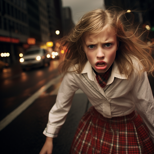 Photo of angry face, Taylor Swift, pushing behind of 8 years old little girl and girl almost fall on the road NY, midnight, raining,The little girl, 120cm tall, is dressed in a white long-sleeved collared shirt and a red checkered skirt. Photo taken with a Canon 5D Mk4.