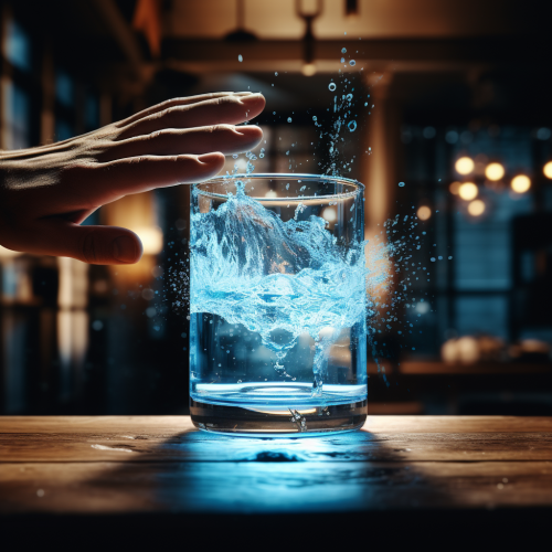 a glass of water on a subwofer that is creating vibration from a music, wehre there is a light above the wayer. The picture is caputred using a dslr camera in 4k ultra hd